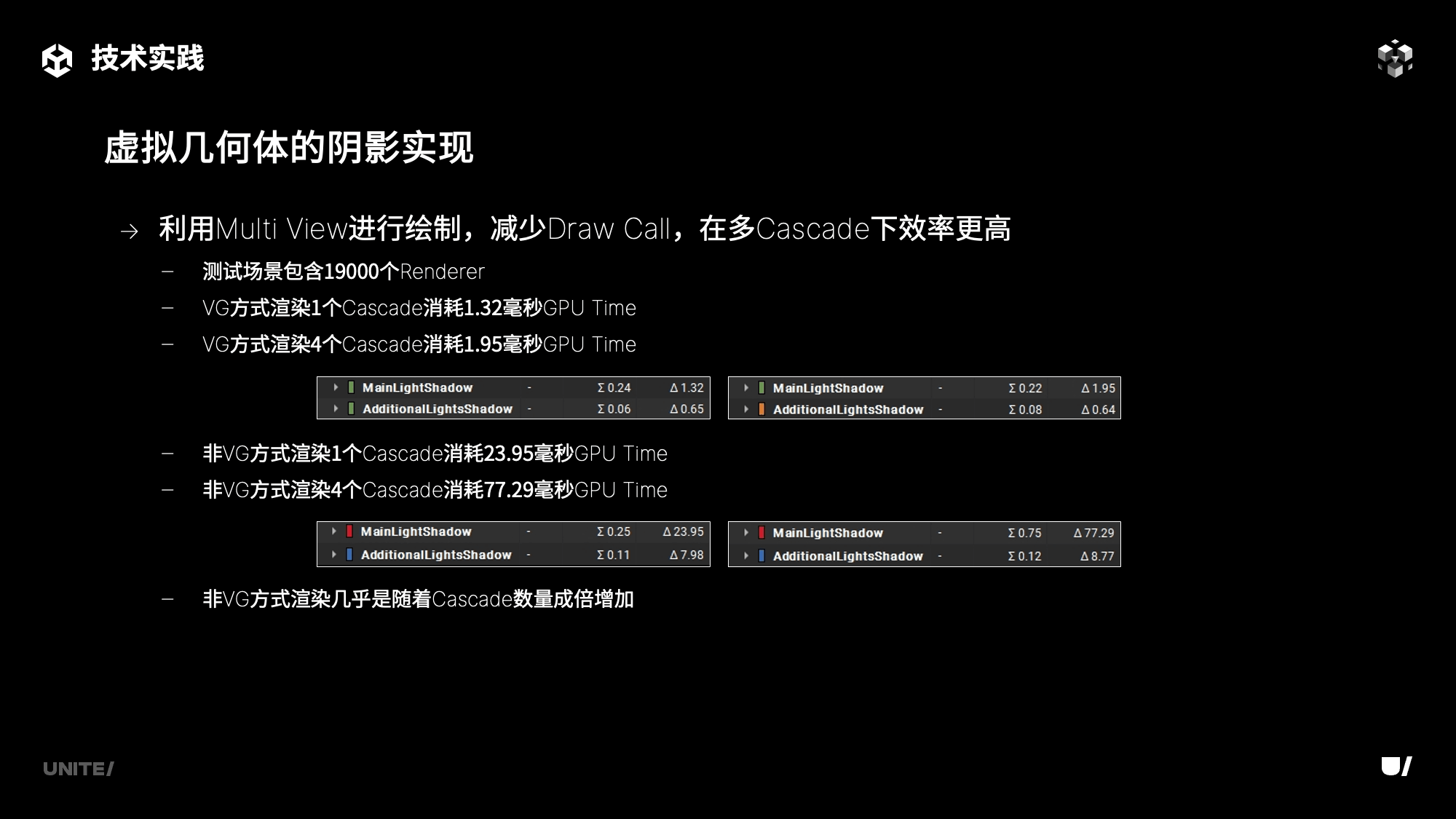 而Multi View的引入则是在GPU层面提高了渲染效率,同样是该测试场景,分别在1个Cascade和4个Cascade的情况下,非VG方式渲染的GPU Time则几乎是随着Cascade数量的增加成倍增长,而VG方式渲染CSM的GPU Time并没有随着Cascade数量的增加增长。这为虚拟几何体的CSM带来了更高的多Cascade渲染效率,在有多个产生阴影的Additional Light光源时,提升尤为明显。