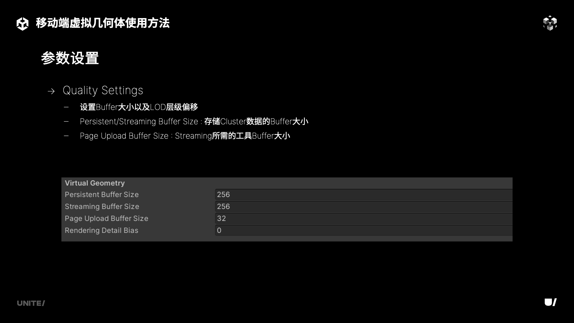 不同于桌面端硬件,移动端设备,特别是苹果设备对内存限制相对严格,为此团结引擎在项目设置的Quality栏中添加了虚拟几何体部分Buffer大小的参数设置,方便各位开发者根据目标帧率、目标设备和项目资产进行更改。其中Persistent Buffer决定了项目中Mesh的数量,如果Mesh的数量越多它所需要的Persistent Buffer的大小就越大,而Streaming Buffer则是与项目目标平台的渲染分辨率相关。如果渲染分辨率提升,相应的Streaming Buffer的大小也会需要提升。而Page Upload Buffer需要在LOD自适应过程中提供一个中转的Buffer来将Streaming所需要的配置数据由硬盘转至GPU显存中,如果需要在场景快速移动的过程中有更好的LOD自适应表现,也需要将这个Buffer大小变大。
