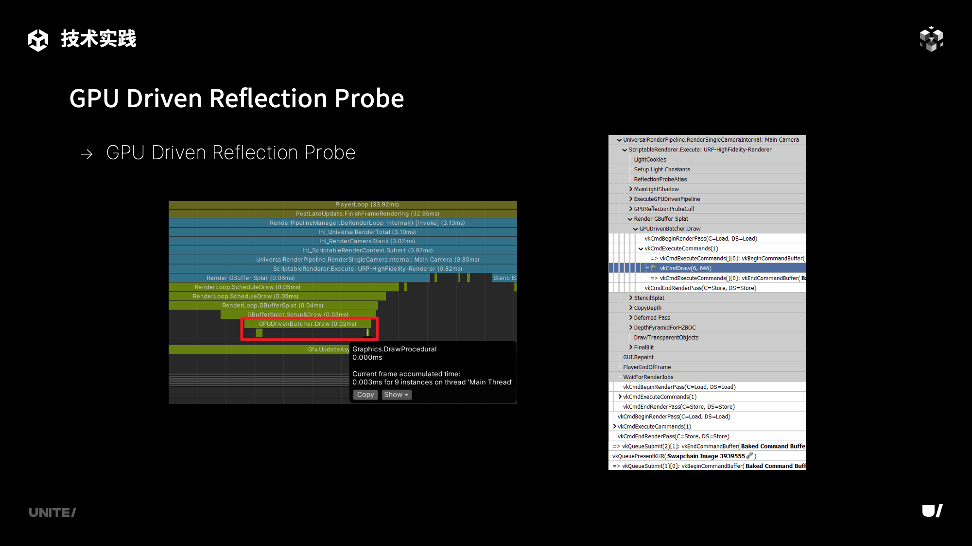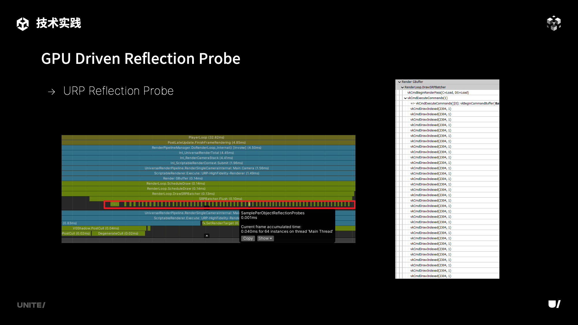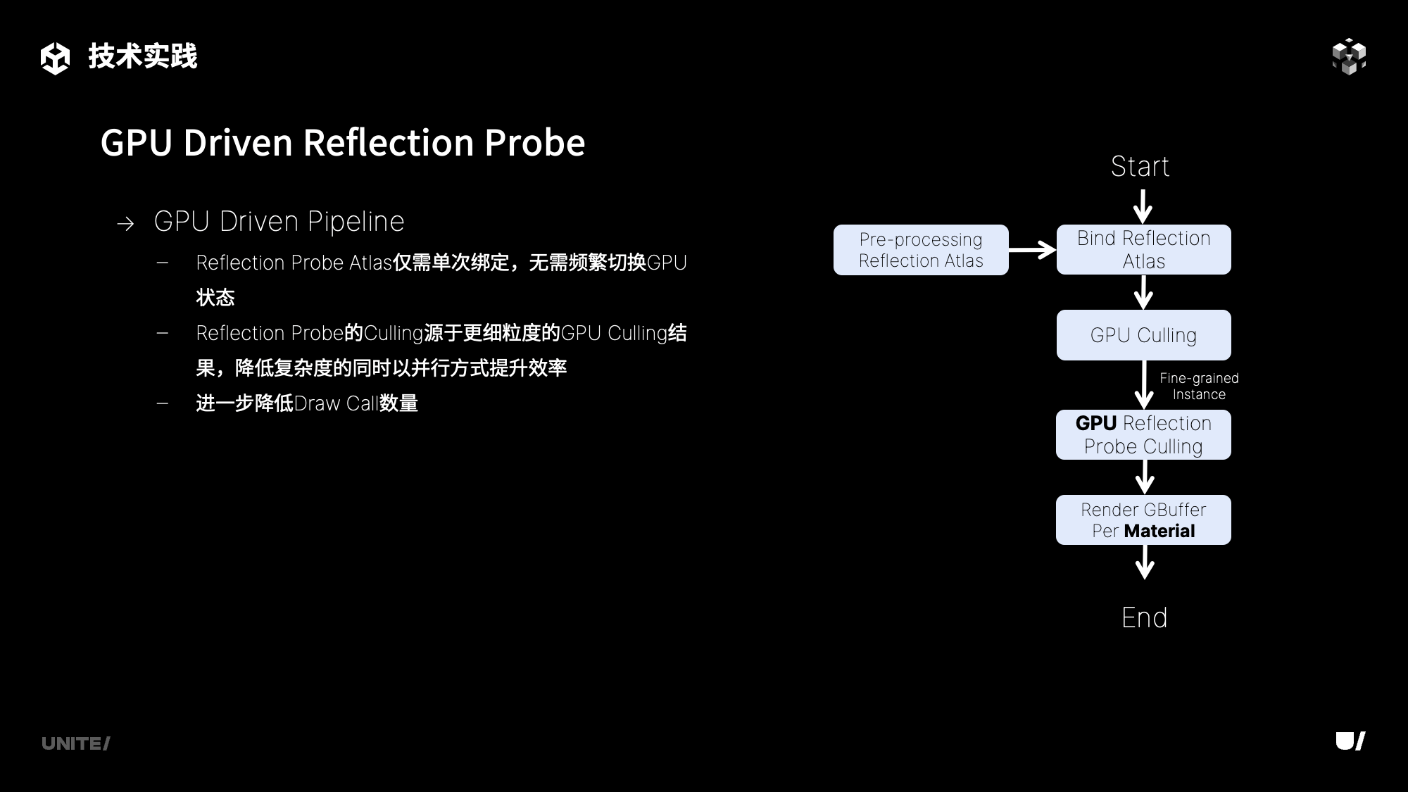 单张Atlas可以减少Texture的绑定次数,此外Reflection Probe的剔除也被替换为了更高粒度的GPU剔除方案,提升了剔除效率,降低了Over Draw,并减少了Draw Call的数量。
