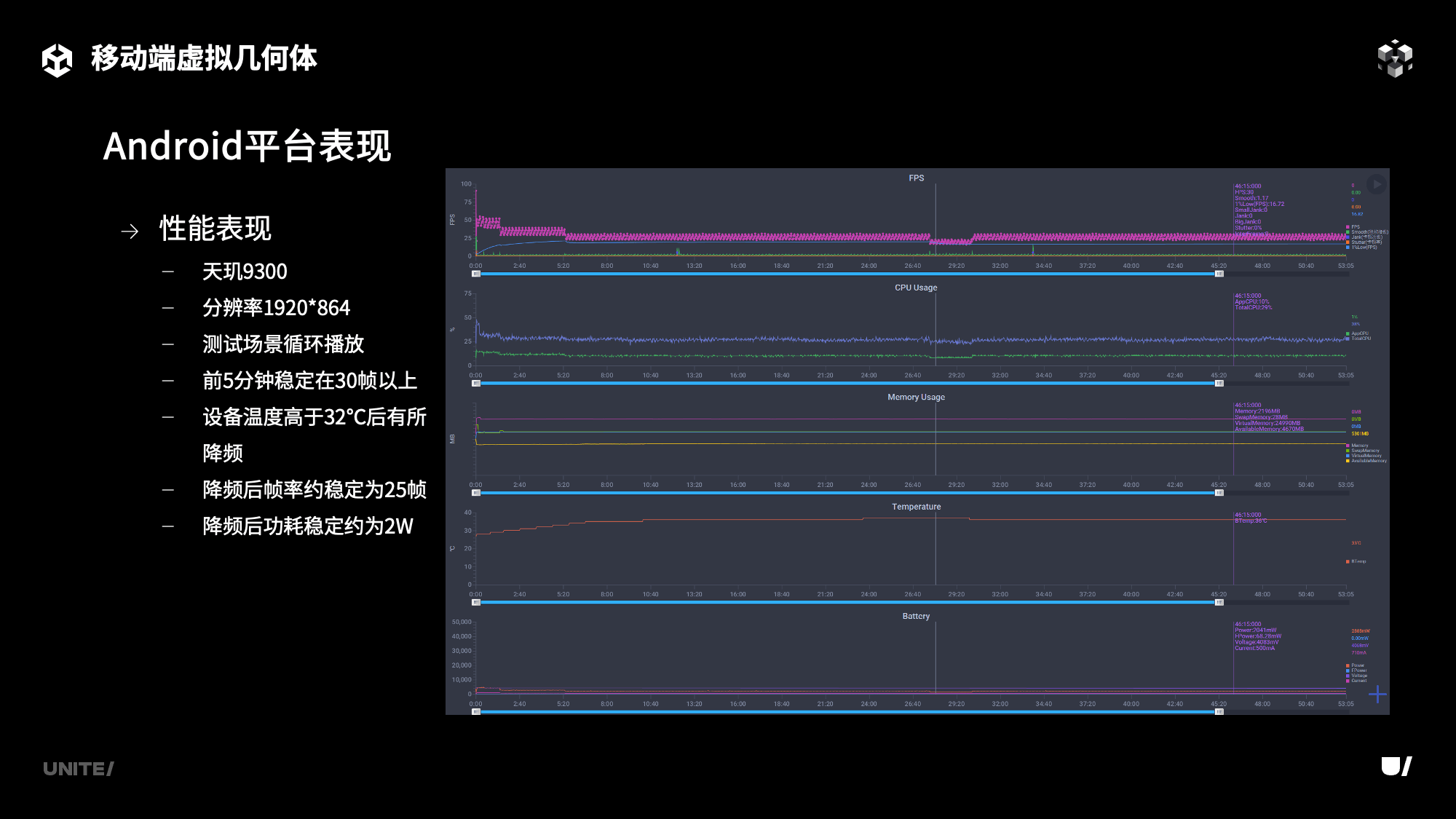 在安卓上长时间使用的表现与在iOS上类似。在天玑9300的设备上,分辨率设置为1920*864,还是之前的这个场景。前5分钟可以稳定在30帧以上。而后手机的温度上升到32℃以上之后,SOC会有一定程度的降频,最后帧率稳定在平均25帧左右。功耗大约是2W左右。