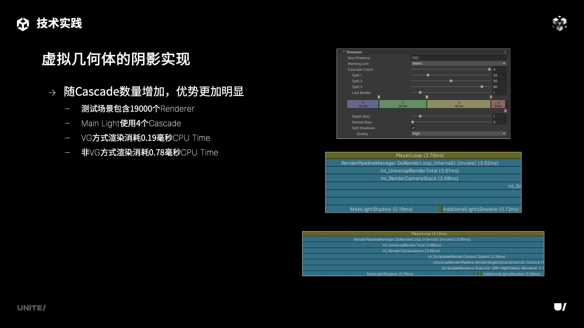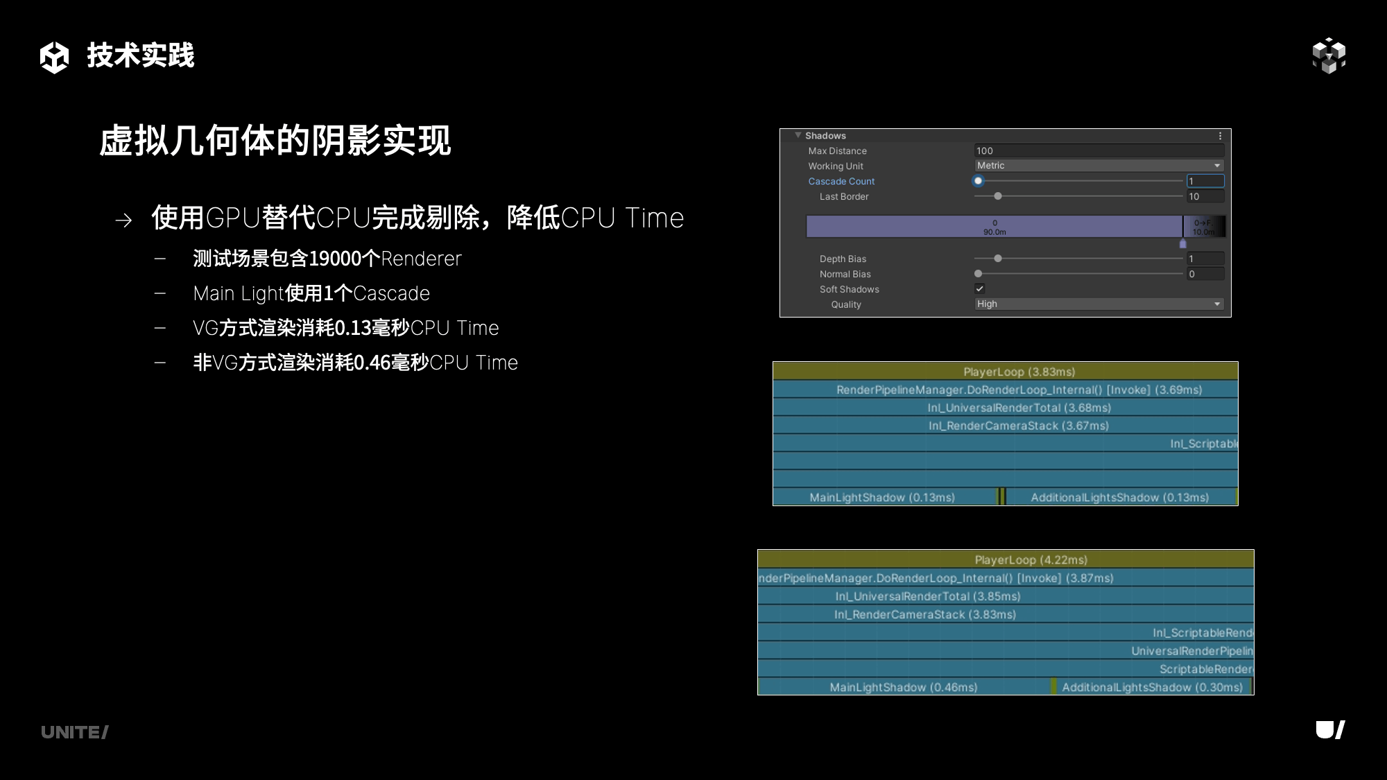 以Main Light的CSM阴影为例,我们进行了测试,所选择的测试场景是刚刚实机展示的场景,该场景包含了约19000个Renderer,使用GPU取代CPU完成剔除,在1个Cascade下,VG相较于非VG的方式节省了0.33毫秒的CPU Time,这部分时间的减少主要源于CPU不再参与剔除工作所带来的优势。