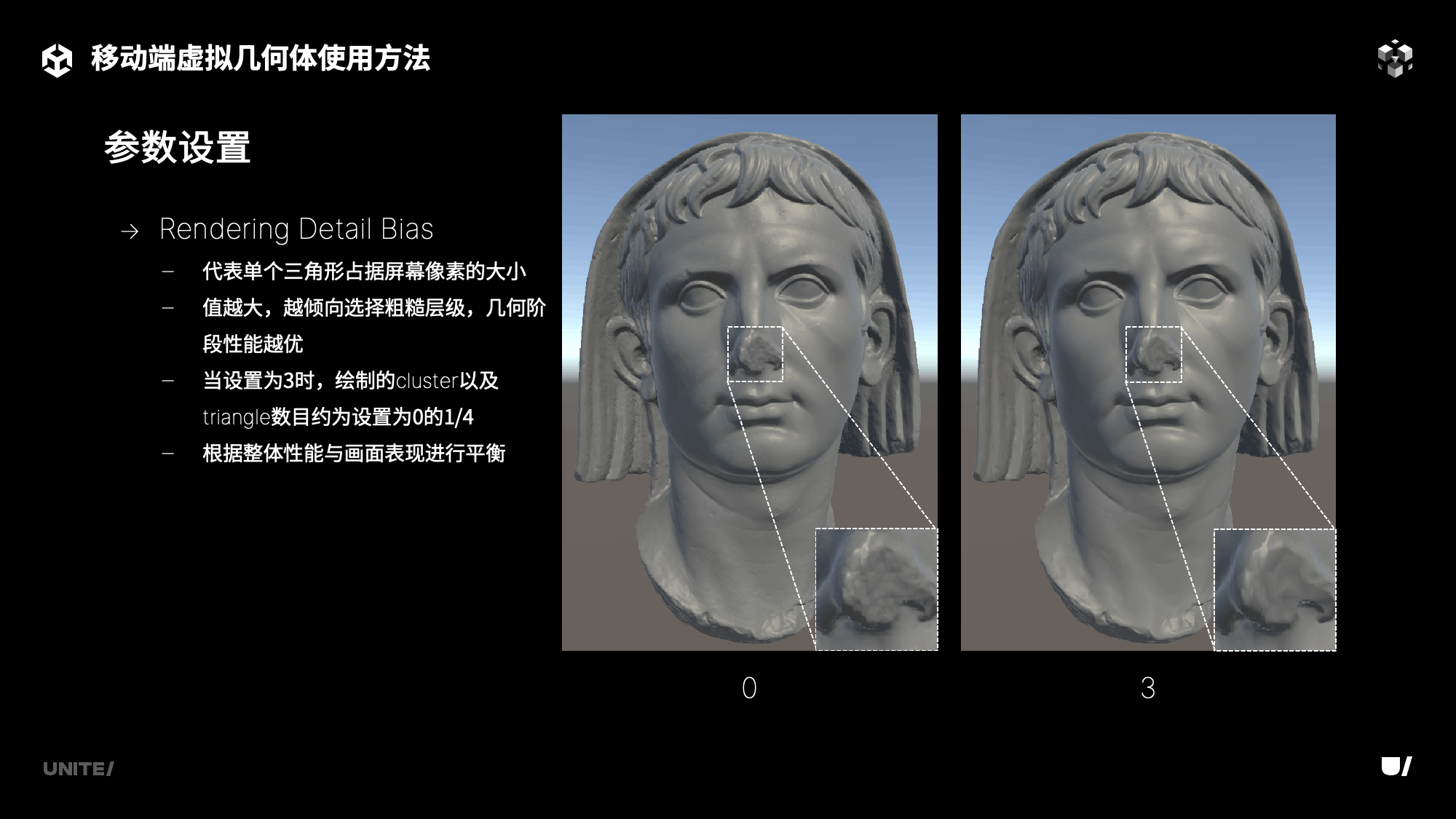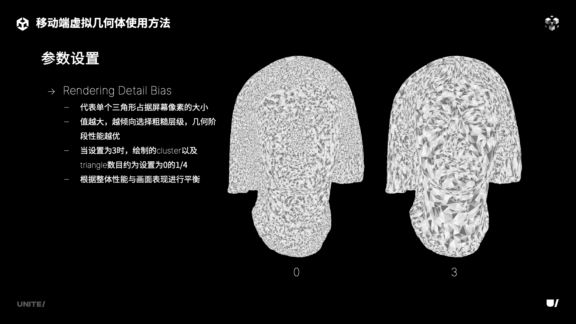同时对于浮点算力较弱的移动端设备,团结引擎提供了Rendering Detail Bias选项。该选项决定了虚拟几何体自适应LOD变化过程中选择的单个三角形所占屏幕像素的大小,值越大,越倾向于选择粗糙层级的三角形,在相同距离下模型绘制的三角形数量减少,几何阶段有更优的性能表现。