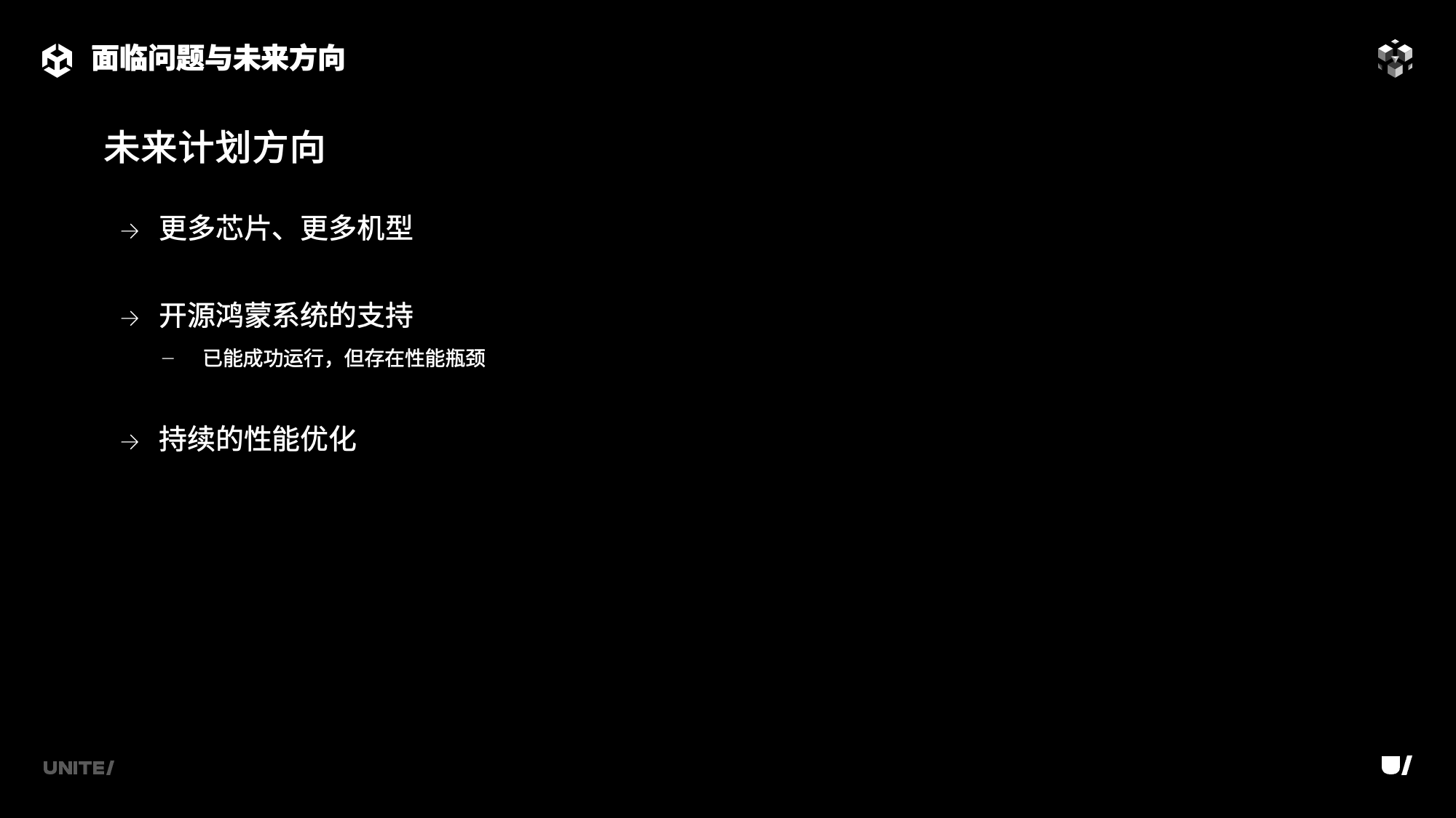 以上是技术实践部分的内容,接下来我将讲述目前团结引擎移动端虚拟几何体功能所面临的问题和未来的开发方向。