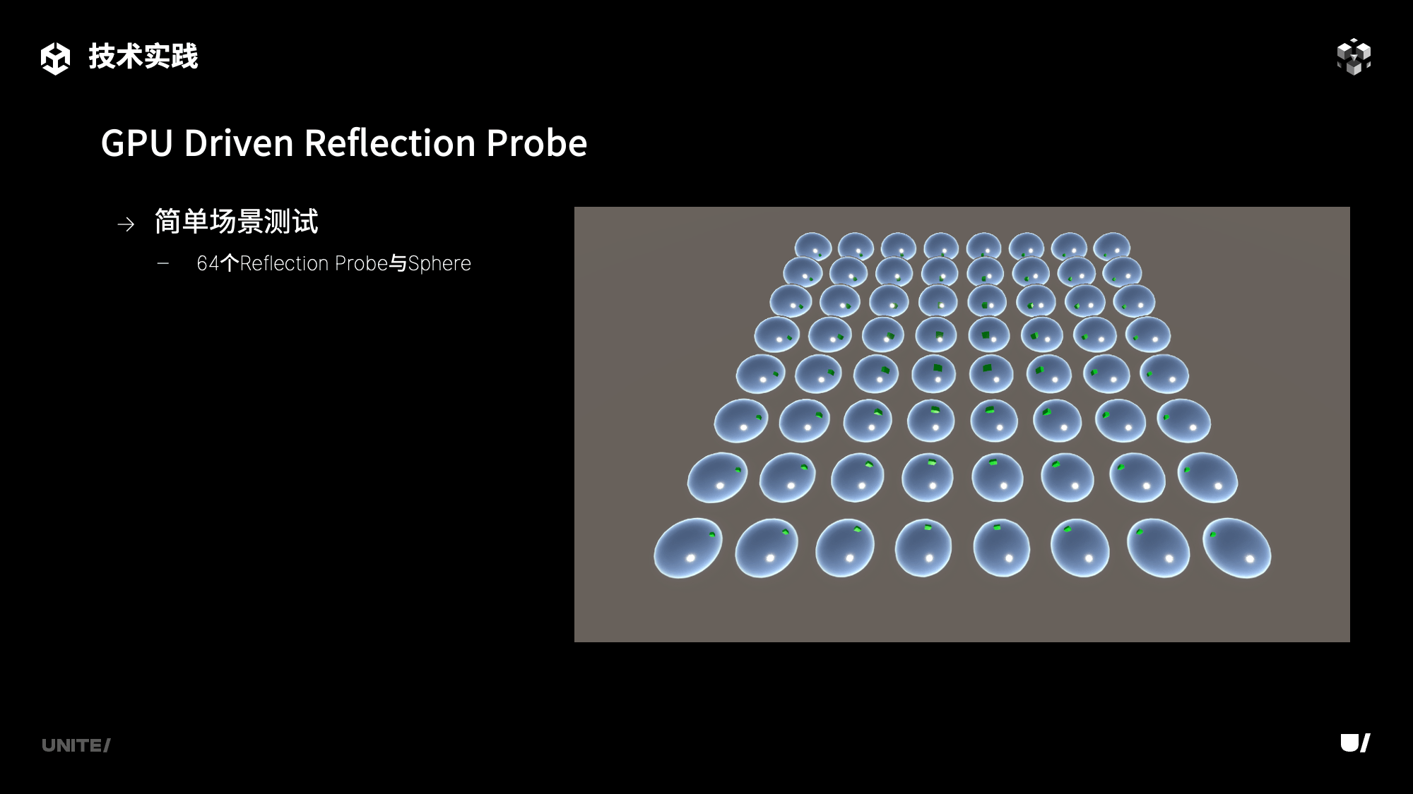 我们创建了一个简单场景进行性能测试,场景中摆放了64个使用相同材质的Renderer以及64个与之对应的Reflection Probe。