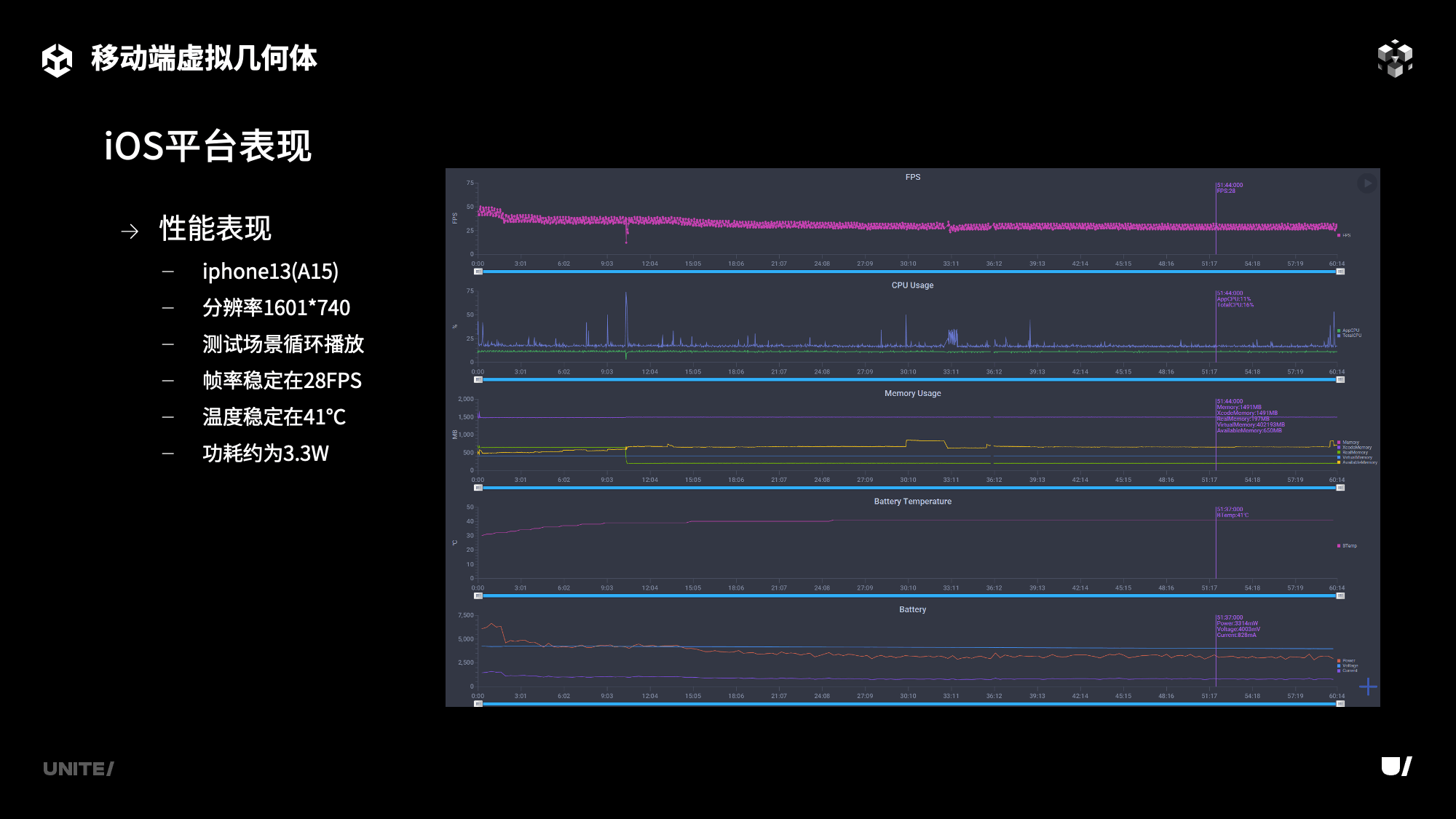 以上就是虚拟几何体在移动端的运行情况,可以看到对于这样比较高面数的场景,VG在移动端可以发挥非常大的优势。我们看一下在长时间使用的情况之下,移动端VG的表现。上图为在iphone13搭载了A15芯片下进行的性能测试。分辨率是1601*740,测试场景是视频demo中演示的场景,对着刚才看到的雕像阵列进行旋转观察,测试时间是一个小时。可以看到手机的温度随着时间会有上升,从最开始的30℃,在大约进行到30分钟的时候上升到41℃。随着温度上升,Soc发生降频,功耗从最开始的大概6W的功耗,到一两分钟会降低到不到5W的功耗,最后在半小时左右稳定在3W的功耗。而帧率也从最开始的稳定50帧左右逐步下降,最终是稳定在了28帧。可以看到在一个非常高消耗的场景,在iphone13这样的机型上,最终帧率也是可以稳定在30帧左右的。